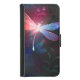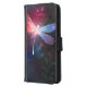 Glowing, flying, red dragonfly, with transparent, detailed wings on dark, nocturnal, luminous background with tropical plants and fireflies. Red dragonfly.