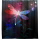 Glowing, flying, red dragonfly, with transparent, detailed wings on dark, nocturnal, luminous background with tropical plants and fireflies. Red dragonfly.