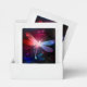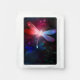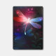 Glowing, flying, red dragonfly, with transparent, detailed wings on dark, nocturnal, luminous background with tropical plants and fireflies. Red dragonfly.