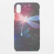 Glowing, flying, red dragonfly, with transparent, detailed wings on dark, nocturnal, luminous background with tropical plants and fireflies. Red dragonfly.