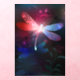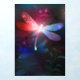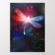 Glowing, flying, red dragonfly, with transparent, detailed wings on dark, nocturnal, luminous background with tropical plants and fireflies. Red dragonfly.