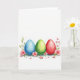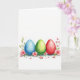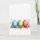This design shows three softly painted egg shapes resting along the lower third of a bright white background, like quiet companions gathered close. From left to right, the colors move from gentle sky blue to fresh green and then to deep red, each one edged with a light, watery glow. At the base of every egg, small pink blossoms with tiny yellow centers curl around in a way that feels like a tender exchange between friends, with stems and new leaves leaning toward one another. A few loose petals are sprinkled beneath, as if they drifted down during a calm spring moment 🌷. The watercolor look lets the pigments bleed and fade at the edges, giving the shapes a soft depth without sharp lines. There is no printed greeting, leaving open space above the artwork for your own Easter message 🐰. The blue egg sits on the left, the green egg in the middle, and the red egg on the right, each with pink flowers clustered near the bottom.