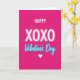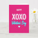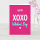 This greeting card features a rich fuchsia background that feels lively and romantic. Down the center, the word “HAPPY” appears in white, set in simple, tall letters. Right below it, “XOXO” is larger and looks like it’s glowing in bright white, giving the middle of the card a warm, spotlight feel. Under that, the words “Valentine’s Day” are written in a smooth, flowing teal cursive near the lower center. At the very bottom sits a small white heart with a thin teal outline, like a gentle finishing touch. The strong pink background and the white-and-teal lettering make the message easy to read and hard to miss. It feels meaningful to give because it says a lot with just a few words—hugs, kisses, and a clear reminder that you care 🥰❤️. Hope it helps you share your Valentine’s Day sentiments.