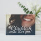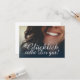 Kompliment Karte mit lachendem Frauengesicht und handschriftlichen Grüßen auf der Vorderseite der Karte. Restliche Flächen stehen zur freien Verfügung.