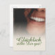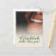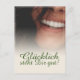 Kompliment Karte mit lachendem Frauengesicht und handschriftlichen Grüßen auf der Vorderseite der Karte. Restliche Flächen stehen zur freien Verfügung.