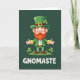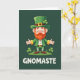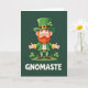 This card shows a cartoon leprechaun centered on a deep emerald background, standing calmly with eyes closed and arms open as if offering a friendly hug 💚. He wears a forest-green top hat with a gold buckle and a small shamrock, paired with a lighter green suit that looks neatly fitted. A fiery orange beard frames his rosy cheeks, adding a warm contrast that makes him feel approachable, like a pal greeting you at the door. Beneath his feet is a small grassy mound with two shamrocks sprouting up, hinting at a sweet, shared moment of luck ☘️. The word “GNOMASTE” sits below the character in large white letters, placed near the bottom and easy to spot at a glance. Subtle shading and highlights give the figure a gentle 3D look, with the hat brim and beard catching light while the suit falls into soft shadow. The overall scene stays simple and focused, with the leprechaun’s open palms facing outward against the smooth green backdrop and the white title anchored underneath.