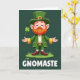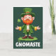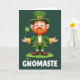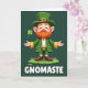 Designed with a friendly leprechaun-like gnome at the center, this St. Patrick’s Day illustration shows him standing on a small patch of bright green grass with his arms open as if welcoming a close friend in for a hug 💚. His eyes are gently closed, and the relaxed tilt of his head gives him a tender, easygoing look that feels like a quiet inside joke shared between pals. A warm ginger beard and mustache frame his face, standing out against his green outfit and the deeper green background. He wears an emerald top hat with a gold buckle, a matching coat with gold cuffs, and brown boots that anchor him to the ground. To his left, a single three-leaf shamrock floats in the air like a small lucky sign ☘️. The word “GNOMASTE” sits along the bottom in crisp white letters, centered and easy to read against the green. The background stays a darker green field with the shamrock hovering beside him and the grass patch beneath his boots.