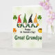 Designed with four gnomes lined up across the upper middle, this St. Patrick’s Day scene feels like a friendly little group photo, with their shoulders nearly touching as if they’re leaning in for each other. Each gnome has a tall patterned hat—white polka dots on red, green, and near-black, plus one with an orange pattern—above long white beards and small rosy noses that give them a gentle, affectionate look. The background is a soft green gradient that keeps everything cozy and lets the characters stand out, while scattered shamrocks in deep emerald and orange add extra holiday detail 💚. One gnome holds a gold mug, another shows off a small locket close to his chest, and a third presents a glowing golden orb, like they’re sharing little treasures between friends. In the lower right corner, a pot of gold sits tipped slightly forward, filled with dark shapes that read as coins or shadowed treasure. Below the gnomes, “Happy St. Patrick’s Day!” appears in dark lettering across the page, with “Great Grandpa” set underneath in a rich green line of text ☘️. The shamrocks float around the figures while the pot of gold anchors the bottom-right edge against the green backdrop.