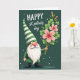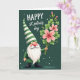 This greeting card shows a friendly gnome on the left, with a long flowing white beard, a cheery red nose, and rosy cheeks under a tall green-and-white striped hat. He wears a rich green outfit with a dark belt and sturdy black boots, standing as if he’s just stepped in to greet someone he cares about. Lifted in his hands is a bouquet that feels like a sweet offering between friends, mixing lots of green shamrocks ☘️ with large soft-pink flowers that have dark centers and a few slim red buds. The background is a deep forest green with a light texture and scattered white speckles that look like tiny flakes drifting across the scene. In the upper right, the message “HAPPY st. patrick’s day” appears in white lettering, with “HAPPY” larger and “st. patrick’s day” smaller beneath it. The open space on the right balances the gnome’s wide hat and beard, keeping your eye moving between the greeting and the bouquet 💚. Green tones dominate the card, while the pink blossoms stand out sharply against the darker backdrop and the white speckles.