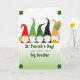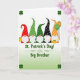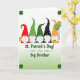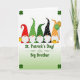 This card shows five faceless gnomes lined up side by side on a white background that fades into a soft green wash near the bottom 💚. Each gnome has a fluffy white beard and a peach-toned nose, and their closeness reads like a friendly group photo where everyone has leaned in together. The hats carry the personality: one tall red hat with tiny white speckles, two green hats with different spot patterns, a black hat with white dots, and an orange hat with stripes. On the far left and far right, shiny gold mugs sit like bookends, suggesting a shared toast between pals. The last gnome also has two balloons tied to its hat—one green and one golden—floating up to the side ☘️. Centered beneath the lineup, the text “St. Patrick’s Day! Big Brother” appears in deep green, with matching swirly flourishes and a small crown just above. Four dark green shamrocks sit in the corners, framing the gnomes against the pale background.