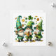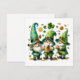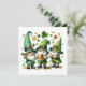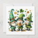 This cheerful holiday card captures the lively spirit of St. Patrick's Day with three jolly gnome-like characters, each dressed in festive green attire. They wear tall, pointed hats decorated with shamrocks and other playful elements. The gnome on the left and the gnome in the middle both hold frothy mugs of beer, while the gnome on the right claps joyfully. Scattered around them are classic St. Patrick's Day symbols, such as shamrocks, gold coins, and a large three-leaf clover at the top center. The white background enhances the vibrant green colors and festive elements, making this card a delightful choice for spreading St. Patrick's Day cheer. 🍀