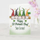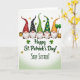 On the front of the card five friendly gnomes line up across the upper third of a bright white background that fades into a soft green glow near the bottom 💚. Each one has a fluffy white beard and a tall cone hat, and their close spacing makes them feel like a little group sharing the moment. The hats mix patterns and colors: red and black with white polka dots, two green hats with white and yellow spots, and one rich orange hat with a textured, Celtic-like look. The leftmost gnome holds a shiny gold mug, while on the right two green balloons float beside the last gnome, with a tiny pot of gold tucked nearby ☘️. Around them, small shamrocks in green and in thin gold outline dot the open space like confetti. Centered below the gnomes, the message “Happy St. Patrick’s Day! Step Sister!” appears in dark forest green, sitting just above the green glow. More shamrocks trail around the text and toward the lower edge, with the gold-outlined ones catching the eye against the white.