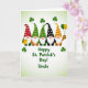 This card shows five cute gnomes lined up across the center, their long white beards brushing against their round bodies as they lean close like old friends. Each wears a tall pointed hat with its own pattern and color—red with white polka dots, two green hats with swirling designs, black with white polka dots, and a gold-and-orange striped hat—set against a soft background that shifts from pale lime to creamy white 💚. Small shamrocks are scattered around them, adding little pops of green ☘️. On the far left, one gnome hugs a golden mug, and the cozy tilt of his hat makes him look like he’s offering a quiet toast to the group. On the far right, another gnome holds a tiny pot of gold, and a cluster of green and gold balloons rises above it. Beneath the gnomes, the message “Happy St. Patrick’s Day! Uncle” sits centered in green lettering, easy to spot against the light backdrop. The lineup feels close-knit, with the gnomes’ shoulders nearly touching, as if they’re sharing a private joke while posing for a photo. The gold coins, floating balloons, and scattered shamrocks frame the row of hats and beards across the middle of the card.