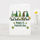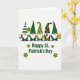 This greeting card shows five gnomes lined up shoulder to shoulder on a white background, like close friends leaning in for a group photo on St. Patrick’s Day 💚. Each has a fluffy white beard and a bright orange nose, and their green hats range from deep forest to lime, with touches of white, black, yellow, and orange that tie them together. One gnome wears a green-and-white striped hat and holds a black horseshoe, while another with dotted headwear lifts a green balloon as if offering it to the group ☘️. A third gnome shows off a four-leaf clover, and the last raises a foamy mug of beer, adding a cozy, celebratory feel to the lineup. Beneath the gnomes, the phrase “Happy St. Patrick’s Day” appears in green lettering, centered and easy to spot. Small shamrocks sit around the text like little accents that echo the hats above. Their closeness and the way each item is presented toward the viewer gives the scene a friendly, affectionate energy. The bottom area features the green greeting with shamrocks on either side, neatly spaced under the row of gnomes.