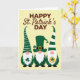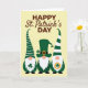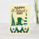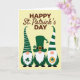 This St. Patrick's Day card features three gnomes standing close together on a pale yellow background, their white beards brushing their green outfits as if they’ve leaned in for a friendly photo 💚. Each gnome has a small pink nose and a calm, content expression, and their cozy spacing gives the scene a gentle, affectionate feel. The center gnome wears a leprechaun-style hat in green with a black band, a gold buckle, and a tiny shamrock near the brim. On one side, a gnome has a green cone hat with white horizontal stripes and a single shamrock, while the other wears a vertically striped hat with a large shamrock emblem framed by fine gold detailing ☘️. Above the trio, the text reads “HAPPY St. Patrick’s DAY” in warm brown, with “HAPPY” and “DAY” in thicker, simple lettering and “St. Patrick’s” in a flowing, cursive-like style. The lettering sits centered at the top, leaving plenty of open space between the words and the gnomes’ hats. Gold accents appear on the hat buckle and around the shamrock emblem, standing out against the greens and the soft yellow background.