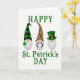 This design shows a bright white background framing three gnomes lined up beneath large emerald-green text that reads “HAPPY St. Patrick’s DAY,” with the words stacked in a tidy layout near the top. Each gnome has a full white beard and a soft peach nose, and they lean close enough to feel like good friends posing together for a quick photo 💚. On the left, one wears a tall, curved hat in green-and-black plaid, and a four-leaf clover pokes out to the side like a small wink of luck ☘️. In the middle, the gnome’s conical hat has a leopard pattern, and two small black crescent shapes suggest eyes peeking out with a shy, affectionate glance toward the others. On the right, the last gnome wears a classic green top hat with a black band and a gold buckle, standing steady as if proudly keeping the group together. The mix of hat patterns against the simple white space adds contrast while the repeated greens tie everything into a cozy St. Patrick’s Day scene. Fine texture details show in the fluffy beards, the plaid lines, the spotted hat, and the shiny buckle on the top hat.