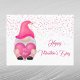 Pink gnome holding a pink heart saying "Be Mine" with silver and confetti hearts.