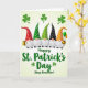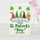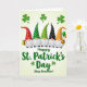 Made to share a sweet St. Patrick’s Day scene, this card shows five gnomes lined up shoulder to shoulder, their long white beards brushing together like close friends posing for a photo 💚. Each gnome has a peach-toned nose and a tall, polka-dotted hat that curls at the tip, colored red, deep green, light green, black, and golden orange. Behind them, a soft pale yellow-green gradient sets a gentle backdrop, while scattered shamrocks drift across the top like confetti ☘️. The leftmost gnome holds a golden tankard, angled slightly toward the group as if offering a friendly toast. On the right, another gnome presents a small golden pot with green and orange balloons rising up in a neat cluster. Centered beneath the gnomes, the words “Happy St. Patrick’s Day” appear in thick, flowing black lettering with tiny shamrocks tucked between the words. Just below that line, “Step Brother!” sits in matching dark text, with the shamrock accents repeating near the phrase.