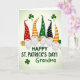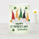 This design shows five gnomes lined up in a friendly row across the card, their long white beards brushing their tunics as they lean slightly toward one another like close companions. Each gnome has a small rosy nose and an extra-tall pointed hat with different patterns—red swirls and dots, orange-and-white stripes, green circles, and black polka dots—set against a soft cream-to-light-green background. Above their heads, several dark green shamrocks float like confetti, adding a festive St. Patrick’s Day touch ☘️. One gnome holds a shiny golden mug while another cradles a little pot of gold, and the way their bodies angle inward gives the group a cozy, affectionate feel. At the far right, a single green balloon rises beside the last gnome, adding a light, airy detail 💚. The beards look textured and fluffy, contrasting with the smoother, stylized hats and simple shapes of their clothes. Centered below the gnomes, the message “HAPPY ST. PATRICK’S DAY! Grandma.” appears in dark emerald-green lettering across the lower area. The shamrocks sit scattered above the procession, while the green balloon hovers near the right edge of the scene.