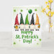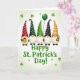 Designed with five gnomes lined up in a friendly row across a soft light-green gradient background, this St. Patrick’s Day illustration feels like a little parade of pals 💚. Each gnome has a big white beard and a small pink nose tucked under a tall cone hat, and the mix of patterns keeps your eye moving from one to the next. One hat has red polka dots, another has deep emerald polka dots, a third shows lime-green stripes, a fourth has black polka dots, and the last features warm orange stripes that nod to Irish colors without overdoing it. A cozy, close-together spacing makes them look like they’re leaning into the moment, as if sharing a private joke while they march along. One gnome holds a golden mug, another lifts a green balloon, and another presents a tiny pot of gold stuffed with green shamrocks ☘️. Small shamrocks are sprinkled around them like confetti, floating across the scene and filling the space without crowding it. Centered near the bottom, “Happy St. Patrick’s Day!” appears in rounded green letters, sitting just below the gnomes against the pale background.