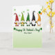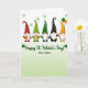 Designed with five gnomes lined up in a friendly little parade, this St. Patrick’s Day scene sits on a bright white background that keeps the focus on their faces and hats 💚. Each gnome has a long white beard and a rosy nose, and their tall cone hats are dotted with polka dots in red, two shades of green, black, and orange. One gnome in red holds up a golden stein as if toasting someone close, while a light-green gnome cradles a shiny pot of gold like a treasured gift. Nearby, a black-hatted gnome stands close to an orange-hatted friend who lifts green and orange balloons, with striped socks peeking out for extra detail ☘️. Small shamrocks are scattered in the open space above them, like confetti floating over the group. The lower portion fades into a soft green gradient where the message is placed in dark green lettering, reading “Happy St. Patrick’s Day! Dear Sister!” with shamrocks on either side. The balloons rise above the orange-hatted gnome, and the green gradient base anchors the text beneath the row of gnomes.