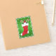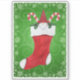 This vinyl sticker has a little gnome wearing a dark red hat in a red Christmas stocking with two candy canes on a green swirl background bordered with snowflakes.