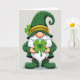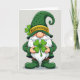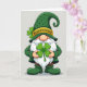 This card shows a St. Patrick’s Day gnome standing against a soft, neutral gray background, dressed in deep emerald and forest greens that feel cozy and close. The tall, spiraled hat is dotted with small black accents, and a gold patterned band wraps around it with a green shamrock perched near the top. A full, snow-white beard spills down the front, while only a round rosy nose peeks out, giving the character a gentle, friendly look. The gnome’s hands cradle a large four-leaf shamrock at its chest, held like a small gift meant for someone special 💚. Matching green boots and a green tunic complete the outfit, with dark outlines that make every shape stand out clearly. The greeting “Happy St. Patrick’s Day” sits near the top in green lettering, with smaller gold text below it that reads “Lucky to have you” ☘️. The shamrock is centered and bright, with the hat’s gold band and tiny black dots adding crisp detail around the upper half of the design.