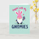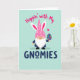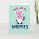 This design shows a stylized gnome-like figure centered on a pastel mint green background, with a long white beard, a small peach-toned nose, and a dark blue tunic. A tall pink cone hat with white polka dots sits on its head, and two bunny ears peek out with bright fuchsia inner details 🐰. The figure holds a decorated egg close to its chest, and the gentle tilt of its head toward the egg gives the scene a cozy, affectionate feel like sharing a small surprise with a friend. The egg is covered in swirling patterns of blue, deep purple, green, and fuchsia, creating a lively contrast against the soft backdrop 🌷. Near the top, the phrase “Hoppin’ with My” appears in pink lettering that curves in an arc above the character. Along the bottom, the word “GNOMIES” is set in dark blue, anchoring the layout beneath the figure. A small fuchsia heart sits near the message, and the hat’s white dots repeat evenly from brim to tip.