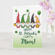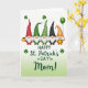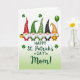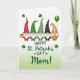 This card shows five cheerful gnomes lined up side by side on a white background that fades into a pale green wash near the bottom 💚. Each one has a tall pointed hat with patterns like white polka dots on red and deep green, white stripes on emerald and orange, and a black hat dotted in white. Their fluffy white beards and rosy noses sit close together, giving the row a cozy, friendly feel, like they’re leaning in for a group photo. Small green shamrocks float around them, adding a St. Patrick’s Day touch ☘️. The leftmost gnome holds a gold mug, while the rightmost has a dark green balloon trailing upward. Near the orange-hatted gnome’s feet, a shiny pot of gold rests on the green-tinted area. Centered below the gnomes, the message “Happy St. Patrick’s Day! Mom!” appears in green, flowing lettering.