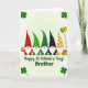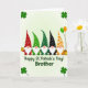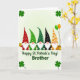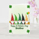 This card shows five friendly gnomes standing shoulder to shoulder in a neat row, each with a long white beard and a blush-pink nose that makes them look sweetly bashful around one another 💚. Their tall cone hats and matching outfits mix red, two shades of green, black, and orange, giving the scene a cozy St. Patrick’s Day look. On the far left, one gnome lifts a golden mug as if clinking a toast with the group, while the others lean in close like a small circle of pals. On the far right, another gnome stands beside a pot of gold, and two balloons—one green and one orange—float up from it ☘️. Some hats have polka dots and others have stripes, so each gnome feels like a different friend in the same crew. The background is a pale green gradient, and three-leaf clovers sit in all four corners like a frame. Centered beneath the gnomes, the message “Happy St. Patrick’s Day! Brother,” appears in dark green text. The pot of gold gleams at the bottom right while the two balloons rise above it against the soft green backdrop.