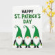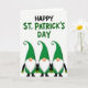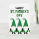 This greeting card features a bright St. Patrick’s Day illustration on a white background, with three matching gnomes lined up across the lower half like close friends posing shoulder to shoulder 💚. Each gnome wears a tall emerald-green hat that curls at the tip, giving the trio a cozy, storybook look as their hats lean in the same direction. Fluffy white beards spill down to frame a small peach-colored nose, and the hidden faces make them feel a little shy, like they’re sharing a private joke. Their simple black outfits keep the focus on the green cuffs and green shoes, tying the figures together with neat pops of color ☘️. Centered above them, the text reads “HAPPY ST. PATRICK’S DAY,” with “HAPPY” in black and “ST. PATRICK’S DAY” in green. The lettering sits in the top half of the card with plenty of open space around it, so the words feel airy and easy to read. The three gnomes stand evenly spaced along the bottom edge, their green hats forming a repeating row of curled points against the white backdrop.