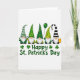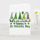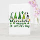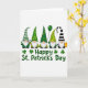This greeting card shows five gnomes lined up in a neat row on a bright white background, their tall cone hats and long white beards drawing your eye right away. Each little figure leans slightly toward the next, like friends keeping close in a cheerful parade, with a gentle, togetherness-in-the-moment feel. Greens dominate the hats and accents, shifting from deep forest to light lime, mixed with black-and-white stripes and sunny yellow polka dots for contrast. The leftmost gnome holds out a three-leaf clover as if offering it to the group, and the next one lifts a horseshoe like a lucky gift. Another gnome steadies a green balloon 💚, while the last raises a frothy mug, adding a cozy, shared-toast touch. Across the top, “Happy St. Patrick’s Day” appears in emerald-green lettering, with small shamrocks sprinkled around the words ☘️. The lighting stays even and bright so the greens, stripes, dots, and little props stand crisp against the white space. The final gnome’s striped hat tilts slightly as the foamy head of the beer sits high above the rim of the mug.