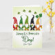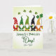 This card features five cozy little gnomes lined up side by side, each with a long white beard and a tall pointed hat in red, green, black, or striped orange and yellow, creating a friendly group scene 💚. They stand against a soft green gradient background that feels like early spring, and their close spacing makes them look like they’re posing together for someone they care about. Above their hats, small dark-green shamrocks float across the top like confetti ☘️. Little story details add charm: one gnome holds a golden mug, another presents a four-leaf clover, and the gnome on the far right grips a thin string that trails off as if it’s tied to something just out of view. The main greeting text, “Happy St. Patrick’s Day!”, sits below the gnomes in dark green lettering, centered and easy to spot. Under that, “Dear Dad” appears in smaller dark green text, placed like a quiet note meant for someone close. The hats show patterns like snowflakes, polka dots, and white spots, while the shamrocks hover in the upper background above the row of gnomes.