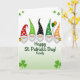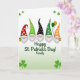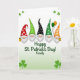 This card shows five gnomes lined up across the middle, set against a background that fades from white into a pale spring green. Each gnome has a full white beard and a small peach nose, with their eyes hidden under tall cone hats that create a cozy, friendly togetherness. The hats vary in pattern and color—red with white dots, light green with tiny shamrocks, black with white spots, deep green with larger white dots, and orange with white stripes—making the row feel like close friends dressed for the same party 💚. Small shamrocks float near the top, while larger clovers sit in the lower corners like a frame. In the center, one gnome holds two balloons, one green and one gold, and the way they lean slightly inward adds a gentle, affectionate note ☘️. The left gnome holds a tiny gold mug and the right gnome carries a small gold pot, balancing the scene with matching little treasures. The greeting “Happy St. Patrick’s Day! Family.” appears in dark green, placed across the lower middle between the corner clovers.