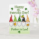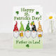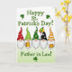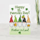 This greeting card shows five gnomes lined up in a cozy row across the middle, their tall cone hats creating a friendly little parade for St. Patrick’s Day 💚. Each gnome has a rosy nose and a thick white beard, and their hidden faces lean toward one another as if sharing a private joke. The hats vary with red polka dots, green swirls, a black hat marked with small white symbols, and orange stripes, and one gnome holds a bunch of balloons that float up and add a light, affectionate touch ☘️. Another raises a golden tankard while a neighbor cuddles a pot of gold, making the group feel like close friends celebrating side by side. The background fades from white at the top into soft green near the bottom, like a gentle wash of spring. At the top, “Happy St. Patrick’s Day!” appears in green lettering, framed by small shamrock sprigs. Near the bottom, “Father in Law!” sits in matching green text, centered beneath the gnomes against the pale-to-green gradient.