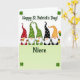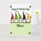This card shows five cheerful gnomes lined up in a little parade across the center, each with a big beard and a tall pointed hat covered in polka dots, flowers, spots, or stripes in red, green, black, and orange. Their emerald and lime outfits pop against a white background that fades into pale green near the bottom, giving the scene a light, airy setting. A few gnomes lift golden steins toward one another, their close spacing and tilted mugs suggesting an easy friendship and a shared toast 💚. In the corners, small shamrocks frame the scene like lucky confetti ☘️. The phrase “Happy St. Patrick’s Day!” sits above the gnomes in green lettering, centered near the top. The word “Niece” appears below them in green, placed near the lower center over the pale green area. On the far right, one gnome holds a tiny pot of gold while orange and green balloons float beside him.