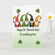 This greeting card shows five gnomes lined up in a friendly row across the top, their tall cone hats patterned with red dots, green shapes, black speckles, and orange stripes. Each one has a fluffy white beard and a small blush nose, and they lean slightly toward one another as if sharing a private joke 💚. The background stays mostly white up top, then fades into a pale green wash below like distant rolling hills. Dark green shamrocks are sprinkled around the lower area, adding little pauses of color ☘️. One gnome holds a bunch of balloons while another presents a tiny golden pot, and the way they angle their bodies toward the group gives the scene a cozy, affectionate feel. The text “Happy St. Patrick’s Day! Granddaughter,” sits across the lower half in emerald green, centered and easy to spot against the light green fade. Soft shadows and small fabric-like textures in the hats help the characters stand out, while the shamrocks dot the space around the lettering, and it’s a friendly way to share St. Patrick’s Day sentiments.