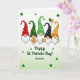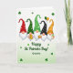 Designed with five gnomes arcing across the top, this St. Patrick’s Day scene shows pointed hats in red, green, black, and golden-orange, decorated with white polka dots and tidy stripes. Only their round pink noses and long white beards peek out, and the way they lean toward one another suggests an easy friendship, like they’ve gathered close for a shared laugh 💚. Three gnomes hold golden cups as if mid-toast, while the one in the black hat lifts two balloons—one emerald green and one gold—high above the group ☘️. On the far right, a gnome steadies a white mug filled with fresh green leaves, adding a cozy, just-poured detail. Behind them, the background fades from white into soft lime green and is sprinkled with dark green shamrocks across the page. Near the bottom, the message “Happy St. Patrick’s Day! Grandma,” sits centered in green lettering. The hats curl upward in different directions, and the shamrocks dot the gradient like confetti around their beards and cups.