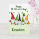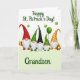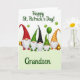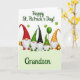 This card shows five gnomes lined up across the front, their tall cone hats in red, green, black, and striped orange standing out against a soft light‑green gradient background. Each has a fluffy white beard and a tiny peach nose, and they lean in close as if sharing a friendly secret. The leftmost gnome holds a golden mug, while the rightmost presents a shiny pot, hinting at treasure and a little friendly bragging. A smaller gnome near the center lifts a green balloon 💚, adding a gentle touch of affection to the group scene. Above them, green shamrocks drift like confetti, with “Happy St. Patrick’s Day!” placed near the top in green lettering. Near the bottom, “Grandson” appears in darker green text, centered beneath the gnomes. The hats show stitched texture and shading, and the pot has bright highlights next to the floating shamrocks and a small ☘️.