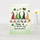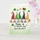 This card shows five St. Patrick’s Day gnomes lined up shoulder to shoulder across the center, their round bodies and long white beards giving them a cozy, companionable look 💚. On the left, a gnome in a red polka-dot hat raises a golden mug, as if toasting the others, while two green-hatted gnomes beside him wear swirling patterns that echo the shamrocks around them ☘️. Near the right side, a gnome in a black hat holds red and green balloons that float upward like a small parade, and the last gnome wears an orange-striped hat while presenting a shiny pot of gold. Their hats and props pop against a light green gradient background, with soft shading that makes the figures look gently rounded and close together, like friends leaning in for a photo. Small shamrocks in different green tones are scattered around the lineup, filling the space without crowding the characters. The message “Happy St. Patrick’s Day! Great Grandma!” sits in dark green lettering, placed above and slightly over the group so it reads clearly at a glance. The gold mug, balloon strings, and the pot’s bright highlights add little points of shine among the reds, greens, black, and orange. A sprinkling of shamrocks frames the gnomes on both sides against the pale green backdrop.