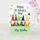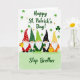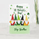 This greeting card shows five gnomes lined up side by side on a white background, their tall pointed hats dotted with polka dots and their long white beards flowing down over bright outfits. From left to right, a red gnome lifts a golden mug as if toasting a friend, followed by two green gnomes who lean subtly toward the group like they’re in on the same joke 💚. Next stands a black-clad gnome holding a shamrock close to the chest, adding a tender, affectionate touch ☘️. On the far right, an orange gnome cradles a classic pot of gold, rounding out the row with a cozy, shared-celebration feel. Centered above the gnomes, the text “Happy St. Patrick’s Day!” appears in green lettering, arcing across the top. Beneath their feet, a light green watercolor-style wash stretches horizontally, and the words “Step Brother” sit on it in matching green. Small shamrocks and tiny golden spark-like dots are scattered around the gnomes, with the polka-dotted hats standing out against the white space.