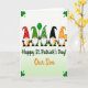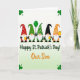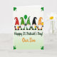 This greeting card shows five gnomes lined up shoulder to shoulder, their fluffy white beards and rosy noses peeking out from under tall cone hats in green and red dots, orange stripes, and one deep black cap. They stand against a pale green background that fades gently from lighter at the top to slightly deeper below, like a soft spring sky settling into grass. Small details make them feel close and friendly—one gnome tips a golden tankard toward the next, while another holds a green balloon as if offering it to a companion 💚. A third gnome presents a shiny pot, hinting at a pot-of-gold moment shared with the group ☘️. The main greeting, “Happy St. Patrick’s Day!”, sits prominently above the characters in green lettering, while “Our Son” appears nearby in warm orange text. Green shamrocks sit in the corners to frame the scene, and the hats’ patterns create a lively rhythm across the row. The illustration is evenly lit with crisp edges, with the shamrocks tucked neatly into the corners around the gnomes.