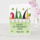 This card shows five friendly gnomes lined up across the upper half, their long pointed hats and fluffy white beards forming a cozy row that feels like a group photo between close friends 💚. Their simple faces show only small noses, so your eye goes straight to the hats: one red with polka dots, one with green spirals, one black, one dark green, and one orange with candy-like stripes. The background is a soft pale-green gradient that suggests early spring, with small shamrocks scattered around like quiet confetti ☘️. On the far left, a gnome holds a golden tankard angled slightly forward, as if offering a shared toast to someone standing just outside the scene. On the far right, the last gnome has yellow and green balloons floating upward, their strings trailing behind his beard and adding lift to the layout. Centered below the gnomes, the words “HAPPY ST. PATRICK’S DAY!” appear in bold green letters, and “Step Dad,” sits underneath in a smaller matching green line. A few shamrock shapes frame the text area, and the balloons arc up along the right edge while the tankard gleams near the left edge.