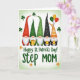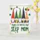 This greeting card shows five gnome-like friends in a cheerful line against a softly shaded green background, their fluffy white beards and rosy noses giving them a cozy, close-knit look 💚. Each wears a tall conical hat in red, two shades of green, black, or orange-and-white stripes, with curling patterns that add movement across the scene. One gnome holds a shiny golden mug, while two others cuddle steaming pots between them as if sharing something warm and comforting ☘️. At the end of the group, the gnome in the orange-striped hat lifts a bunch of green, gold, and red balloons, leaning slightly toward the others like an eager friend joining in. Small shamrocks are scattered around in classic green and a gold-orange tone, dotting the background like lucky confetti. Along the bottom, the message “Happy St. Patrick’s Day! Step Mom,” appears in flowing green lettering, centered and easy to spot. The overall look is softened by diffused light, and the hats, balloons, and shamrocks stand out crisply against the gentle green backdrop.