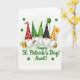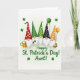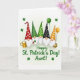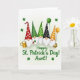 This greeting card shows five gnomes lined up in a friendly row on a white background, leaning close as if they’re sharing a private joke 💚. Their tall cone hats steal the show in red, several shades of green, black, and warm gold, decorated with polka dots, swirls, and stripes. Each gnome has a fluffy white beard and a small peach-colored nose, and their slight tilts toward one another give the scene a cozy, affectionate feel. Emerald green shows up throughout their outfits and in scattered four-leaf clovers that dot the space like confetti ☘️. Golden details add shine, including a foamy tankard held by the leftmost gnome, floating balloons, and a pot of gold tucked into the group. Near the bottom, the words “Happy St. Patrick’s Day! Aunt!” sit centered in bright green lettering. Around the figures, the clovers and gold accents are spaced across the white backdrop, with the balloons rising above the hats and the pot of gold nestled near the right side.