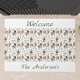 White background, decorated with gnowms and nordic style Christmas decor. Personalize and add your family name. Green text: Welcome
