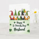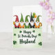 This card shows five cheerful gnomes lined up across the upper half of the scene, each with a fluffy white beard and a rosy nose, leaning slightly toward one another like close friends posing for a photo 💚. Their stout outfits mix reds, oranges, and greens, with one gnome dressed in black for contrast, and their tall hats vary from red-and-black polka dots to textured greens and a green-and-gold striped cap. Small details add a sweet, togetherness feel—one gnome holds a golden tankard, another carries green and amber balloons, and another stands near a shining pot of gold ☘️. The background stays simple and bright, with even lighting that keeps the colors rich without looking harsh. In the lower half, the message “Happy St. Patrick’s Day! Husband” sits centered in dark green lettering. Around the words, scattered shamrocks dot the space like confetti, guiding your eye across the bottom. A soft green gradient washes up from the base of the card, fading gently into the lighter area above. The shamrocks appear in small clusters around the text, with the green fade strongest along the bottom edge.