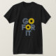 This image features a black t-shirt with a motivational design printed on the front. The design consists of the phrase "GO FOR IT" in bold, stylized letters. The letters "G" and "O" in "GO" are particularly prominent, with the "O" being a bright yellow circle, adding a pop of color to the otherwise monochromatic design. The rest of the text is in white with a striped pattern, creating a visually appealing contrast. This t-shirt is perfect for anyone looking to add a touch of motivation and style to their wardrobe.