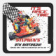 Trendy, modern Go Kart birthday party thank you sticker. Design features typography script ''It's Race Time'' in red lettering , colorful go kart rider illustration, and checkered flag pattern on a white background. Personalize with a name, age and your thank you message in trendy capital lettering. Suitable for any age.