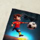 Pictured in a animated 3D design is a soccer player with a soccer ball with fire beneath him